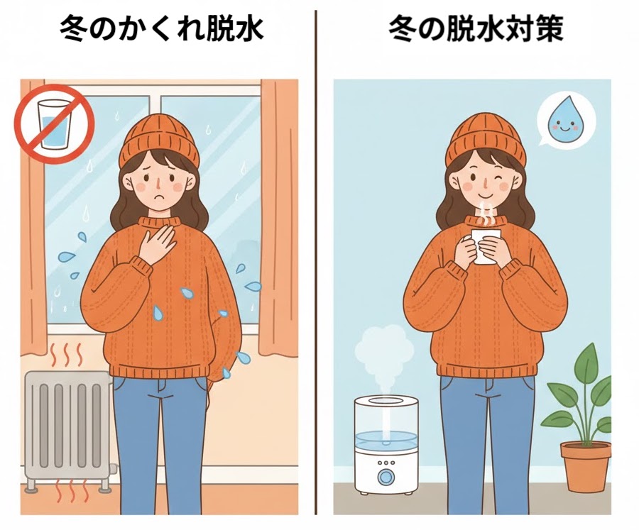 冬は夏に比べて喉の渇きを感じにくいため、無意識のうちに水分不足に陥る「かくれ脱水」が起こりやすい季節です。